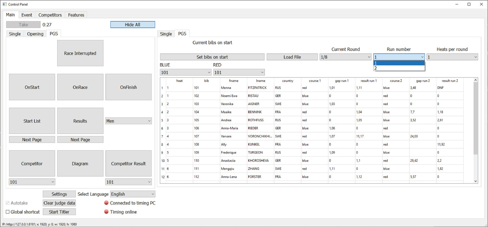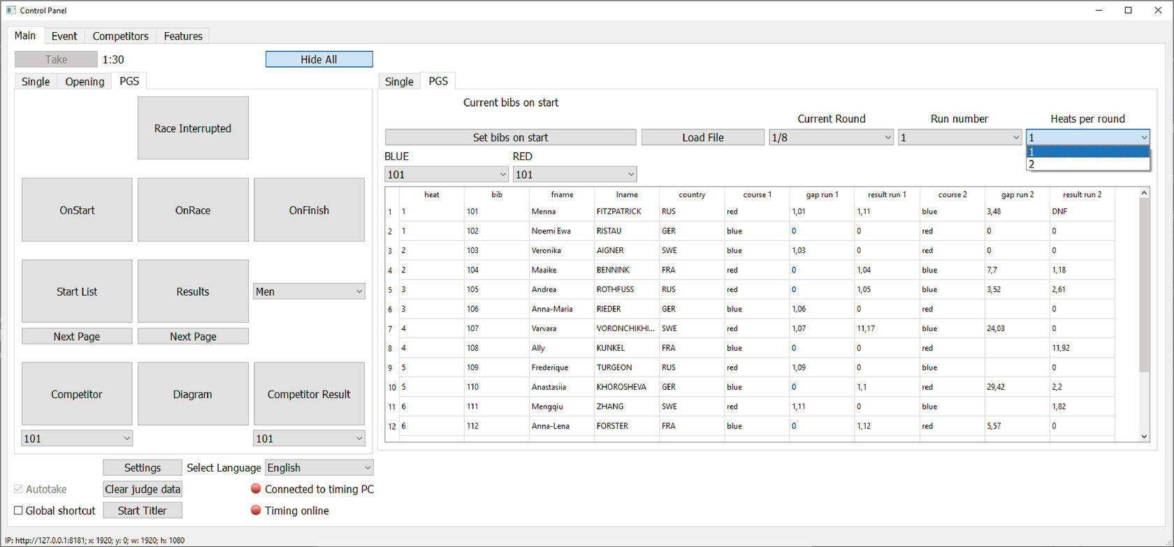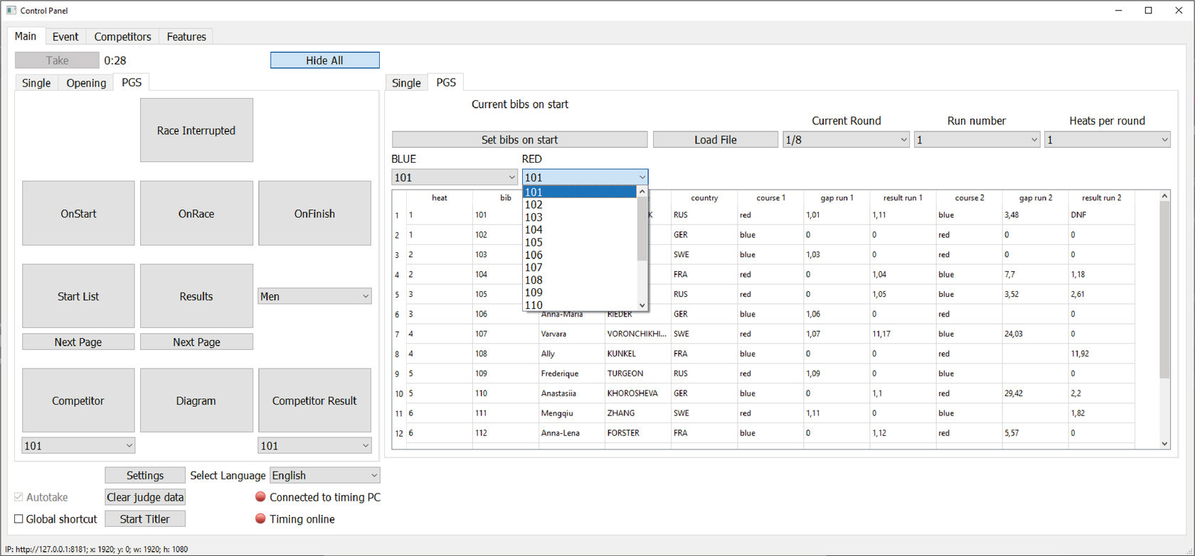 В поле BLUE (синяя трасса, левая на экране) укажите BIB соответствующего спортсмена из выпадающего списка.