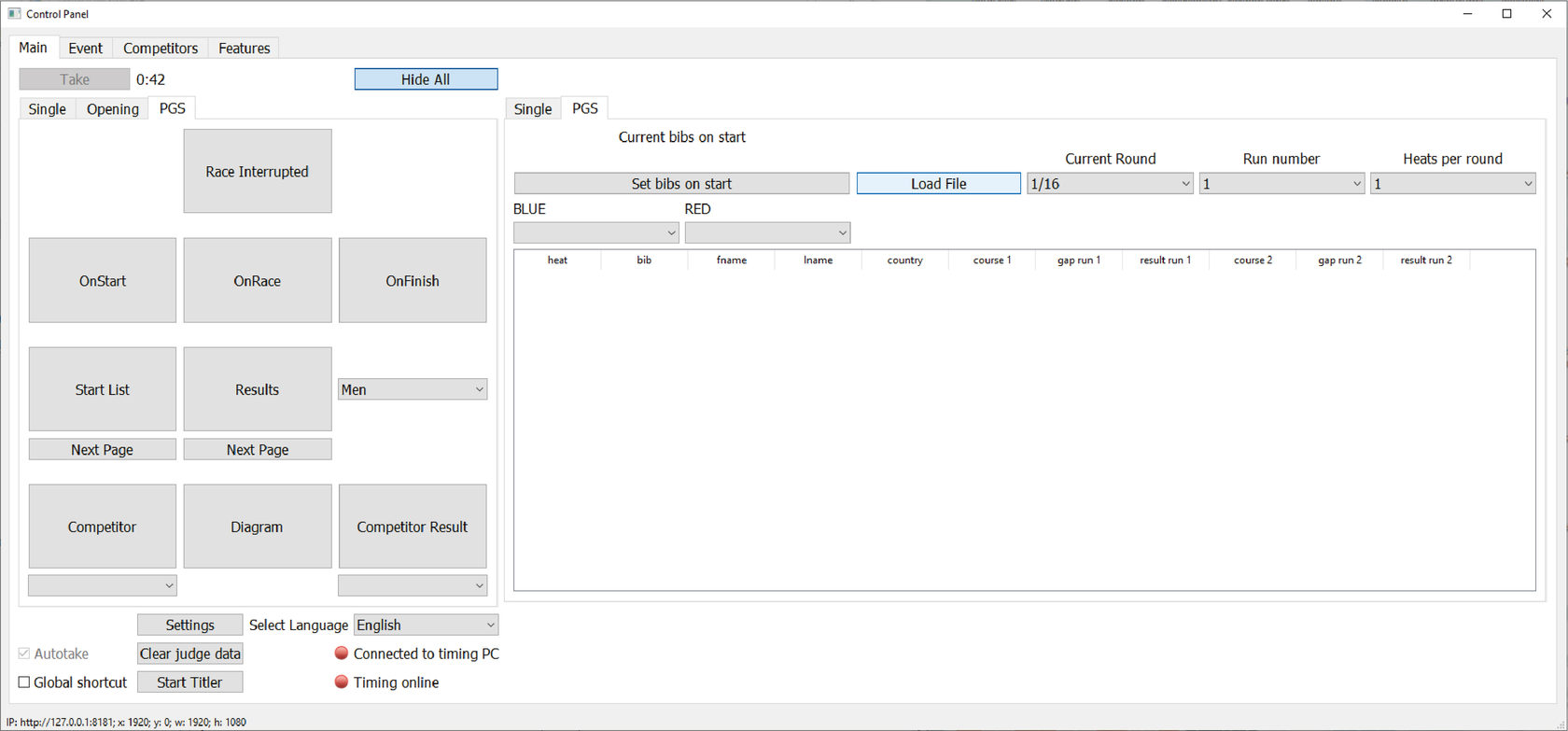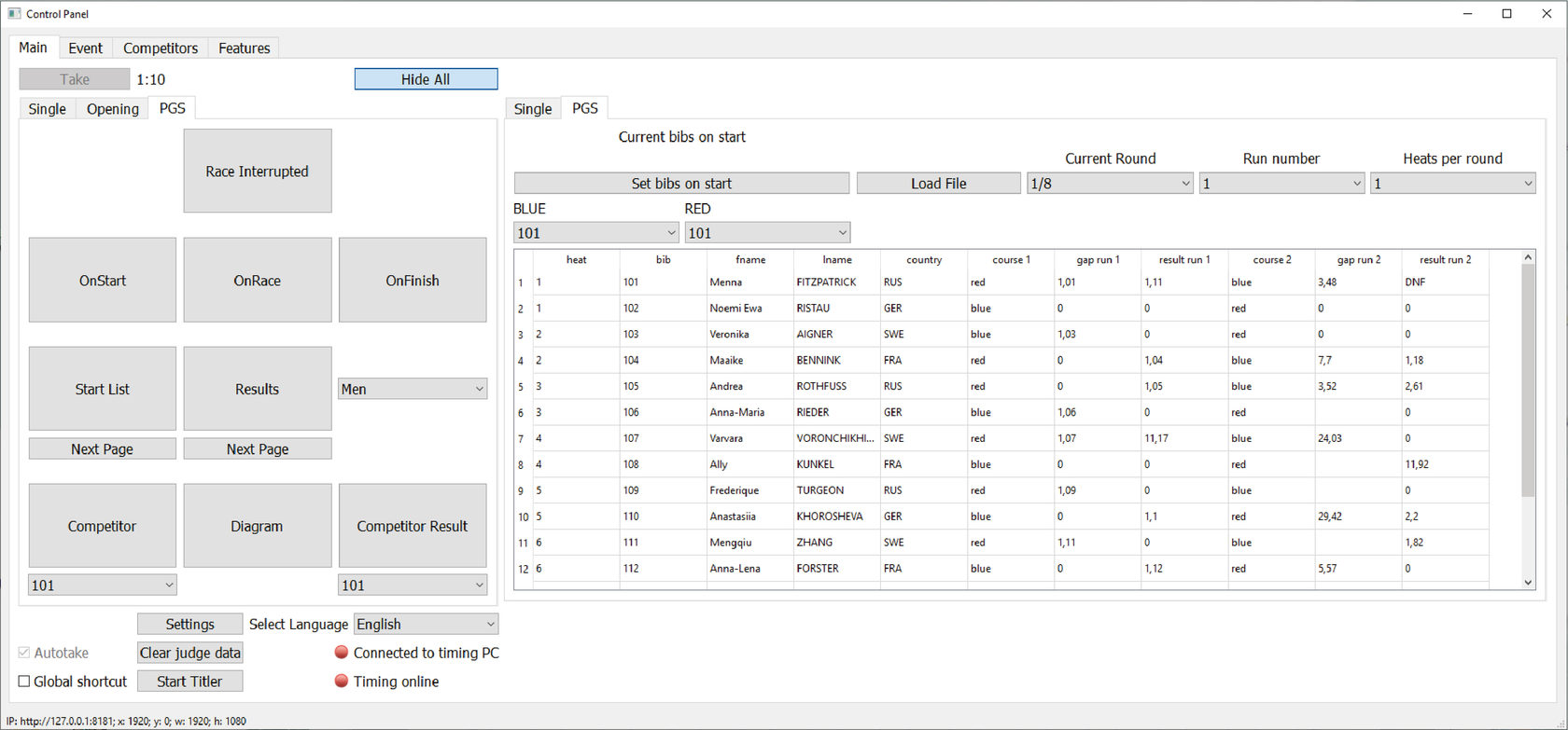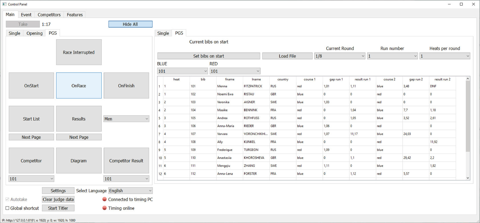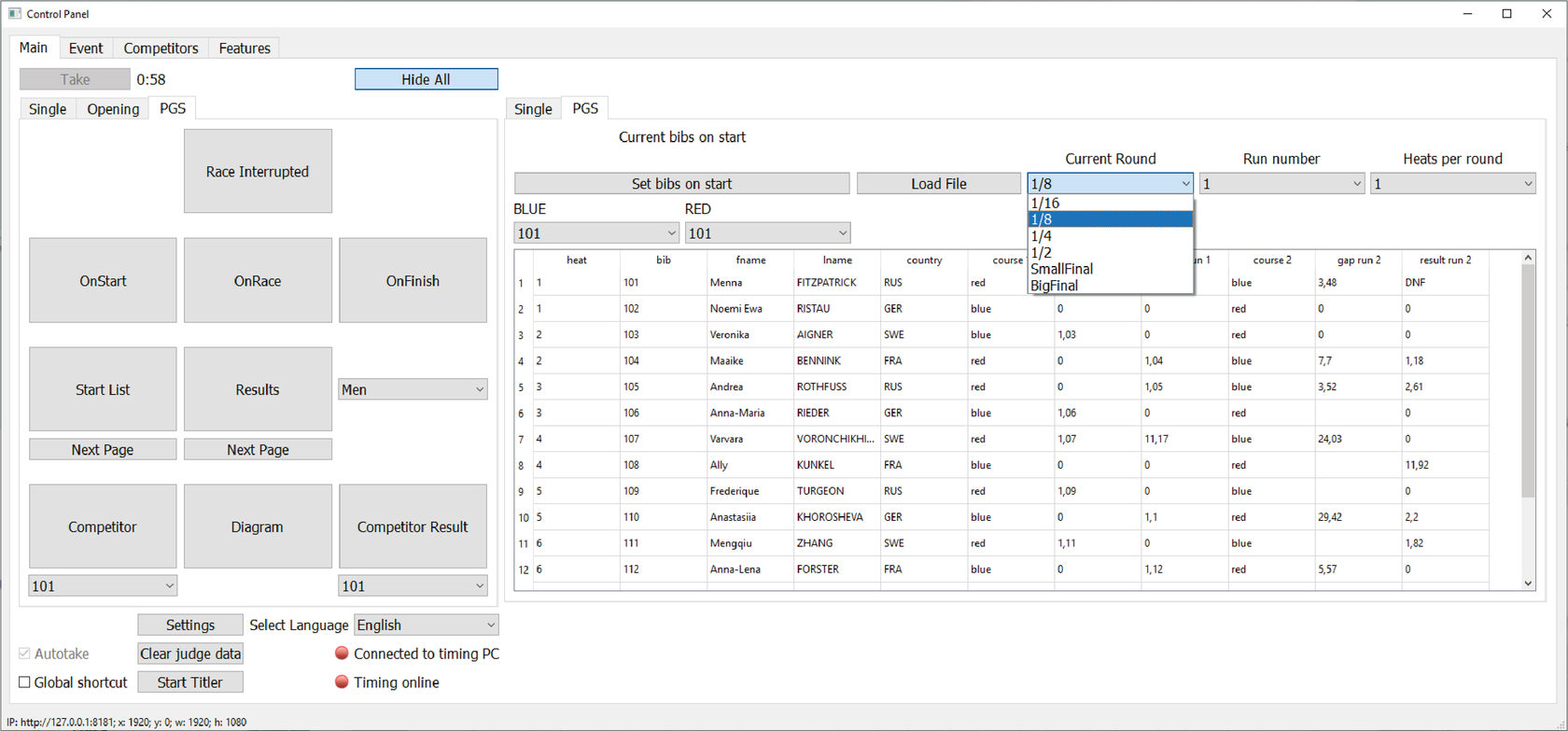 В поле BLUE (синяя трасса, левая на экране) укажите BIB соответствующего спортсмена из выпадающего списка.